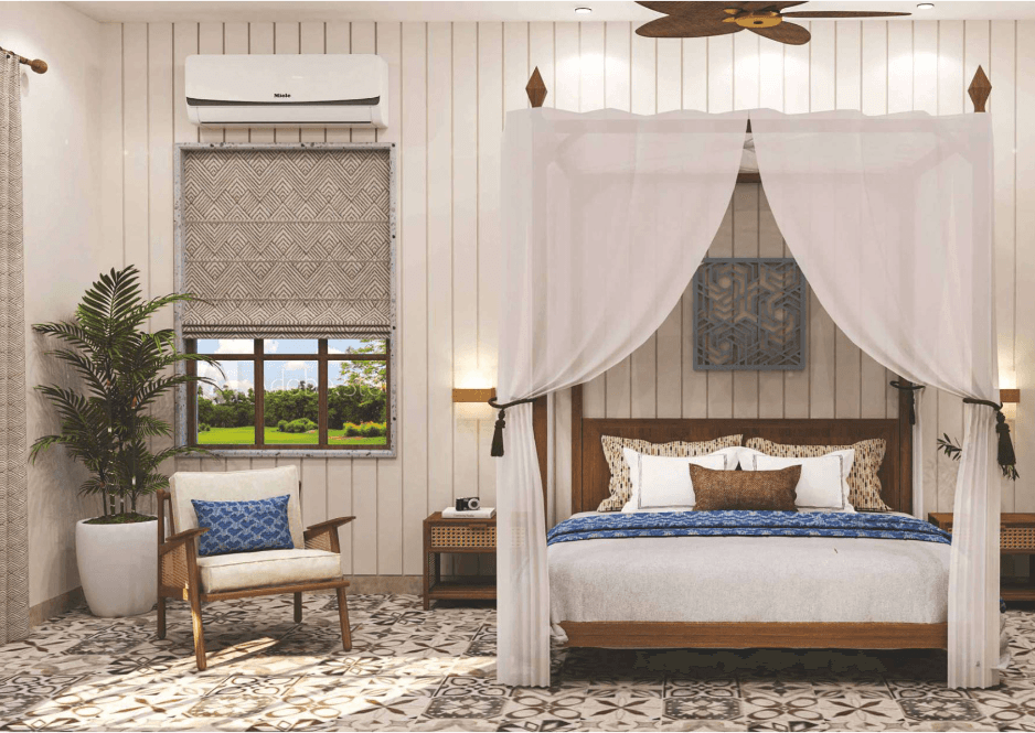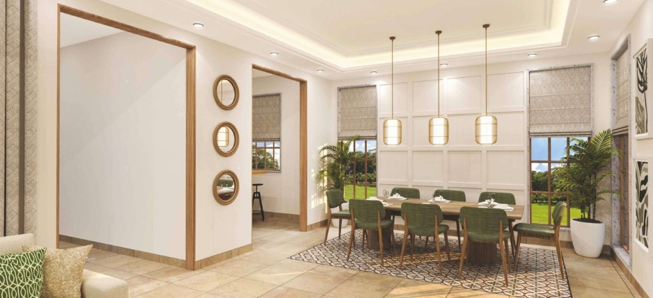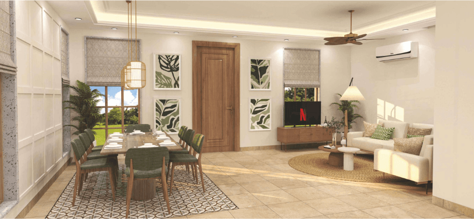 The villa features four generously sized bedrooms, expansive living and dining areas, and curated furnishings designed for immediate comfort. Large openings allow abundant natural light, enhancing the sense of space throughout the home.
